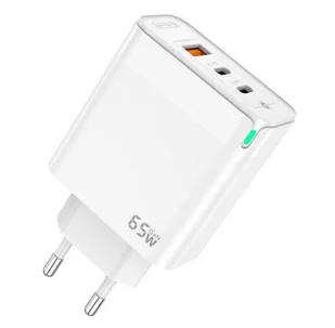 Szybka ładowarka sieciowa 65W QC + PD 3w1 Jellico C79 Jellico C79 to ultra wydajna ładowarka sieciowa o mocy 65W. Jej wielką zaletą są 3 wejścia (2x USB-C, 1x USB-A) dzięki czemu możesz wydajnie ładować 3 urządzenia jednocześnie! Ładowarka 65W idealnie nadaje się do ładowania wszystkich urządzeń moblinych takie jak smartfony, tablety a nawet laptopy. Dzięki tej ładowarce w bardzo szybkim tempie naładujesz w bezpieczny sposób wszystkie swoje urządzenia jednocześnie! Dostępny kolor: - Biały