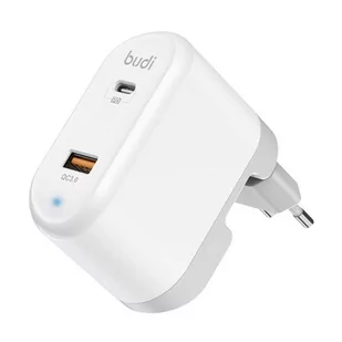 Uniwersalna ładowarka sieciowa Budi 328E, USB + USB-C, 18W + adaptery EU/UK/US (biała)