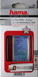Wysokiej jakości bateria Hama Bez efektu pamięci Bateria ProClass Long Life z wysokiej jakości elektroniką ochronną i wysokiej jakości ogniwami Technologia: Li-Ion Dane: 3. 7V / 1000mAh / 3. 7WhPodobne do: HTC BA-S380 itp.