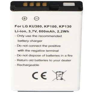 Zamienna bateria odpowiednia do telefonów komórkowych LG(brak oryginalnej baterii)A110, A133, A170, CE110, GB102, GB110, GB130, GM205, GS101, GS105, KE770, KF310, KG280, KP100, KP105, KP130, KP170, KP230, KP235, KP270, KU250, KU380, KU385, T500, -LGIP-430A, -LGIP-431A, -LGIP-531AOdpowiedni jako zamiennik dla następujących modeli akumulatorówLGIP-430A/LGIP-431A, LGIP-531A, SBPL0083220, SBPL0083509, SBPL0089901,SBPL0091401, SBPL0092202, SBPL0092203, SBPL0093301, SBPL0093402, SBPL0096602Wysokiej jakości bateria do telefonów komórkowych z elektronicznym zabezpieczeniem przed przeładowaniem i przegrzaniem. Bateria posiada zabezpieczenie przed zwarciem. Baterię można ładować za pomocą posiadanej ładowarki. Dane techniczne (nie jest to oryginalna bateria): System: bateria litowo-jonowa Napięcie: