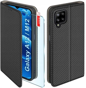 Etui z klapką do Samsung A12 M12 Zamykane Czarne Futerał + Szkło 9H