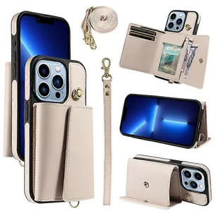 Kompatybilny z iPhone 13 Pro Max Etui na telefon Crossbody Uchwyt na karty Podpórka Pokryty skórą TPU Pokrowiec na telefon komórkowy Beżowy