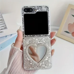 TEMU INS Lusterko do Makijażu z Serduszkiem z Cyrkoniami, Brokatowe Cekiny, Składane Etui na Telefon Samsung Galaxy Z Flip 6 5 4 3, Koreańskie Bling,