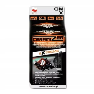 Ceramizer CM-X EXTREME Do regeneracji silników i skrzyń biegów motocykli czterosuwowych sportowych i ekstremalnych z mokrym sprzęgłem. Korzyści: Zapewnia stałą ochronę trących się powierzchni silnika i zatrzymuje procesy ich zużycia na około 5 000 km jazdy sportowej lub 10 000 km standardowej jazdy. Ochrona ta jest szczególnie ważna podczas ekstremalnej jazdy, znacznego obciążenia silnika, wysokiej temperatury oleju, nagłych zmian prędkości obrotowej przy chwilowym zaniku smarowania olejem. Proces tworzenia warstwy ceramiczno-metalowej trwa tylko 100 km. Eliminuje całkowicie suche starty.