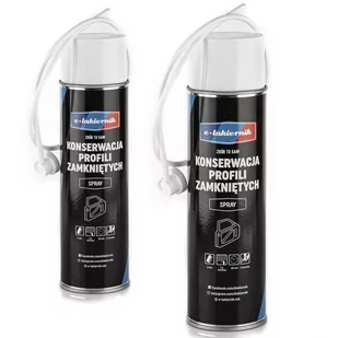 Zestaw 2x e-lakiernik ŚRODEK DO KONSERWACJI PROFILI ZAMKNIĘTYCH 500ml Antykorozyjna powłoka do profili zamkniętych wypierająca wodę i wilgoć. ⚡ Preparat konserwujący na bazie wosków do antykorozyjnej ochrony profili zamkniętych w karoserii pojazdu. Przeznaczony do zabezpieczenia trudno dostępnych miejsc: wewnętrznej strony drzwi, słupków, maski, progów i podobnych elementów. Posiada doskonałe właściwości penetrujące i wypierające wodę.