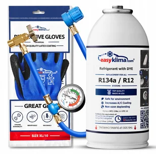 Bezpieczny zamiennik dla R134a, umożliwiający szybkie i proste napełnienie klimatyzacji. Zawiera naturalny gaz węglowodorowy oraz czynnik DYE do wykrywania wycieków za pomocą lampy UV. 1 puszka (170 g netto) = 453 g gazu R134a. Zestaw zawiera: 1 puszka gazu do napełniania (zamiennik R134a) 1 przewód z manometrem 1 ulotka informacyjna 1 para rękawic ochronnych z logotypem Zalety: