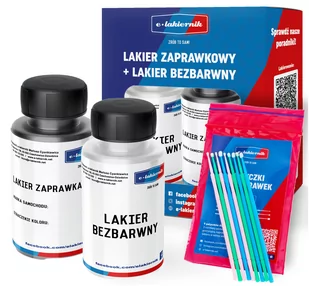 e-lakiernik Lakier Samochodowy Zaprawka Bezbarwny Patyczki Buteleczka lakieru samochodowego w dowolnym kolorze w zestawie z lakierem bezbarwnym i patyczkami do zaprawek. Komplet zapakowany w piękne pudełko ze szczegółową instrukcją użycia. Nasze produkty sprawią, że błyskawicznie zapomnisz o rysach i odpryskach w powłoce lakieru Twojego samochodu.