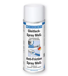 WEICON Anti-Friction Spray MoS2 Suchy smar wysokotemperaturowy, Powłoka MoS2 dwusiarczku molibdenu "Anti-Friction Spray MoS2 jest suchym, beztłuszczowym smarem o wysokiej oporności ciśnieniowej i termicznej (od -200°C do +450°C). Powłoka smaru nie przyjmuje kurzu, brudu ani wody, jest odporna na oleje, smary i wiele innych substancji chemicznych oraz wykazuje dobrą przyczepność do metali, tworzyw i drewna. Wysoka zawartość dwusiarczku molibdenu zapewnia czystość smarowania, redukcję tarcia i umożliwia zastosowanie preparatu jako smaru awaryjnego oraz wyciszającego hałasy pracy urządzeń. WEICON Anti-Friction Spray MoS2 korzystnie wpływa na warunki pracy łożysk ślizgowych, przekładni i innych elementów ślizgowych, szczególnie w warunkach wysokiego ciśnienia i niskich prędkości ślizgowych. WEICON Anti-Friction Spray MoS2 przeznaczony jest do aplikacji na takich elementach jak prowadnice i szyny, pasy transmisyjne, rolki pasowe i leje, urządzenia infrastruktury załadunkowej, jako powłoka na urządzeniach tnących oraz jako alternatywa dla silikonowych preparatów separujących oraz przy wszelkich aplikacjach wykluczających użycie smarów olejowych lub tłuszczowych.
