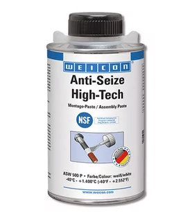 Pasty montażowe z atestem NSF Anti-Seize „High-Tech” posiada wysoką odporność termiczną oraz świetne właściwości separujące, nie zawiera metali, jest neutralna dla materiałów i posiada atest NSF. Anti-Seize „High-Tech” jest szczególnie zalecana w aplikacjach, w których preparaty zawierające metale mogą powodować reakcje elektrolityczne, wymagane są ekstremalna odporność termiczna, atest do kontaktu z żywnością oraz estetyczna barwa preparatu. Zastosowanie: W aplikacjach, w których preparaty zawierające metale mogą powodować reakcje elektrolityczne Cechy i Zalety: Trwała ochrona przed korozją Wysoka odporność termiczna Nie zawiera metali Neutralna dla materiałów Atest NSF Estetyczność Dane techniczne Baza Biały olej o medycznej czystości Barwa biały Lepkość przy +25 °C (DIN 51757) 1,42 g/cm³ Współczynnik tarcia 0,10-0,13 Współczynnik tarcia- całkowite 0,13 µ Współczynnik tarcia- gwint 0,11 µ Współczynnik tarcia- odwrócone 0,14 µ VKA-TEST (DIN 51350) obciążenie robocze 3.