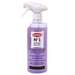CarPlan No1 Super Gloss Super połysk i ochrona do 12 miesięcy - Atomizer 600ml CarPlan No1 Super Gloss stanowi innowacyjną formułę wykorzystującą opatentowaną technologię, która tworzy trwałą powłokę ochronną, jednocześnie zapewniając salonowy połysk lakieru. Do stosowania na lakierze, szkle, gumie, reflektorach, elementach plastikowych oraz chromie. 10 MINUT APLIKACJI, 12 MIESIĘCY OCHRONY! Właściwości : Opakowanie: Atomizer - Płyn Pojemność: