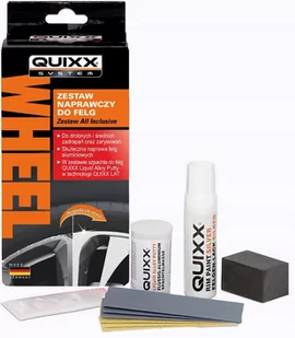 QUIXX - ZESTAW NAPRAWCZY DO FELG ALUMINIOWYCH Stworzony na bazie innowacyjnej technologii płynnego aluminium, pozwala szybko wyeliminować uszkodzenia na felgach aluminiowych. Usuwa zarysowania oraz drobne ukruszenia z obręczy. Pozwala wymodelować felgę z powrotem za pomocą specjalnej mieszanki naprawczej, która dokładnie i długotrwale łączy się z aluminium. Miejsce naprawy można pomalować specjalnym, srebrnym markerem do felg, który jest dołączony do zestawu. Zestaw zawiera: