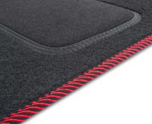 Granulat gumowy Obszycie: Czarno / Czerwona lamówka materiałowa Ilość dywaników w zestawie: 4szt Ilość stoperów w zestawie: 4szt Dodatkowe wzmocnienie na dywaniku kierowcy