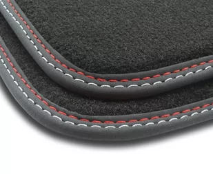 gumowyObszycie: Czarna lamówka skórzana matowa ( nubuk ) obszyta czerwoną i białą nitkąIlość dywaników w zestawie: 4 sztMocowania w zestawie: stopery. . .