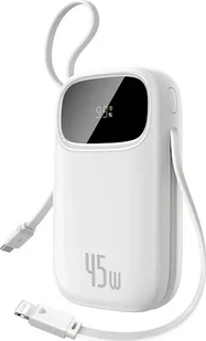 Powerbank Baseus EnerFill FC31 20000mAh 45W z wyświetlaczem cyfrowym i 2 wbudowanymi kablami (USB-C + Lightning) - biały Powerbank Baseus EnerFill FC31 o mocy 45W to zaawansowane rozwiązanie dla tych, którzy oczekują błyskawicznego i bezpiecznego ładowania. Dzięki pojemności 20000 mAh oraz czterem niezależnym wyjściom możesz jednocześnie zasilać kilka urządzeń – smartfony, zegarki, słuchawki i wiele więcej. Dwa wbudowane kable (USB-C i Lightning) pełnią także funkcję smyczy, ułatwiając transport. Cyfrowy wyświetlacz LED informuje o poziomie energii w czasie rzeczywistym, a system NTX z technologią grafenową zapewnia skuteczne odprowadzanie ciepła i kontrolę temperatury. Model FC31 jest zgodny z przepisami linii lotniczych – możesz zabrać go na pokład bez stresu.