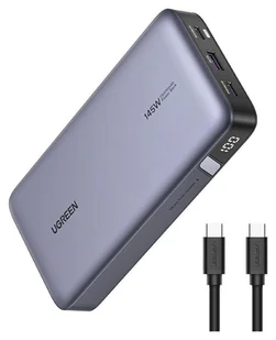 Powerbank 25000mAh Ugreen PB205, USB + 2x USB-C, 145W PD (szary) Odkryj potęgę błyskawicznego ładowania z Powerbankiem Ugreen PB205. Wyróżniając się maksymalną mocą ładowania wynoszącą 145W i wykorzystaniem technologii PD 3. 1 oraz QC 3. 0, PB205 dostarcza superszybką prędkość ładowania dzięki wyjściu USB-C1 o mocy 100 W i USB-C2 o mocy 45 W. Zdolność do uzupełnienia energii MacBooka Pro 14" 2022 do 50% w zaledwie 30 minut to świadectwo tego, że powerbank jest niezastąpionym towarzyszem zarówno w codziennym użytkowaniu, jak i podczas niespodziewanych sytuacji.