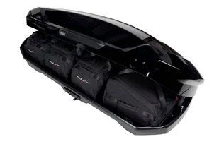 Optymalnie wykorzystują przestrzeń wewnątrz boxu i zwiększają bezpieczeństwo podróży. Torby te są łatwe w załadunku i rozładunku. Torby do boxów dachowych optymalnie wykorzystują wolną przestrzeń w boxie dachowym podczas zimowych lub letnich wakacji. Zestaw toreb na box dachowy składa się ze specjalnie ukształtowanych toreb. Przednia torba ma obniżony profil, dzięki czemu idealnie pasuje do przedniej części boxu dachowego.