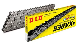 Seria łańcuchów VX firmy DID charakteryzuje się wiodącą w branży, opatentowaną technologią uszczelniania X-ring, która zapewnia dłuższą żywotność łańcucha. Dzięki minimalnej utracie tarcia i ogólnie doskonałej wydajności, seria łańcuchów VX jest doskonałym wyborem dla motocykli i innych pojazdów, które wymagają solidnego, niezawodnego łańcucha. Cechy łańcucha: Kolor: stalowyPodziałka: 530Długość ogniw: