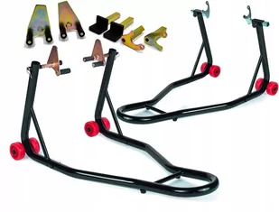 STOJAK PODNOŚNIK NA MOTOCYKL Specyfikacja: Kolor: Czarny z czerwonymi kołami 2 rodzaje uchwytów na tył motocykla Udźwig do 400kg (200kg na stronę) Wysokogatunkowa stal malowana proszkowo Regulowane adaptery Stojaki są uniwersalne, pasują do praktycznie każdego motocykla. Jest to możliwe dzięki zastosowaniu specjalnych uchwytów, które idealnie dopasowują się do większości motocykli.