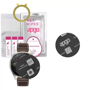 1 x szkło hybrydowe apgo Hybrid Flexible Nano Glass Matte; 1 x sucha ściereczka wielokrotnego użytku; 1 x mokra ściereczka (apgo lub inna w zależności od dostępności); 1 x rakla ułatwiająca montaż; 1 x zestaw naklejek służący do usuwania kurzu tuż przed nałożeniem produktu; 1 x podkładka samoprzylepna ułatwiająca montaż; Po co te kółeczka z uszami ? : ) To podkładki samoprzylepne. Podkładki samoprzylepne rozwiązują problem przesuwającego się urządzenia po blacie podczas montażu. Zegarek/smartwatch/opaska ze względu na swoje małe rozmiary potrafi mocno przesuwać się po blacie podczas montażu. Podkładki samoprzylepne rozwiązują ten problem.
