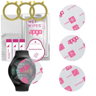 3 sztuki apgo Hybrid Flexible Nano Glass Ultra Clear, szkła hybrydowego do Huawei Watch GT 2e Wersja Ultra Clear - super przejrzyste, nie zmienia barw wyświetlanego obrazu, błyszczące, transparentne. Chroń urządzenie przed pęknięciem i zarysowaniami! Cechy: niepękające, odporniejsze niż hartowane; połączenie zalet folii hydrożelowej i wytrzymałości szkła hartowanego; jedna z warstw to silikonowy podkład anty-uderzeniowy, zapewniający ekstremalnie skuteczną amortyzację efektów uderzeń; wzmocnienie ekranu do 350%; Full Glue - klej na całej powierzchni; twardość 8H (ASTM D3363); warstwa oleofobowa z ceramiczną powłoką; ultra cienkie (0,3 mm); Szkło hybrydowe zakrywa płaską część wyświetlacza - w zamian jednak posiada wyższą odporność na uderzenia i zarysowania. W zestawie: 3 x szkło hybrydowe apgo Hybrid Flexible Nano Glass Ultra Clear; 1 x sucha ściereczka wielokrotnego użytku; 3 x mokra ściereczka (apgo lub inna w zależności od dostępności); 1 x rakla ułatwiająca montaż; 1 x zestaw naklejek służący do usuwania kurzu tuż przed nałożeniem produktu; 3 x podkładka samoprzylepna ułatwiająca montaż; Po co te kółeczka z uszami ? :