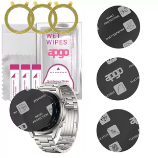 3 x szkło hybrydowe apgo Hybrid Flexible Nano Glass Matte; 1 x sucha ściereczka wielokrotnego użytku; 3 x mokra ściereczka (apgo lub inna w zależności od dostępności); 1 x rakla ułatwiająca montaż; 1 x zestaw naklejek służący do usuwania kurzu tuż przed nałożeniem produktu; 3 x podkładka samoprzylepna ułatwiająca montaż; Po co te kółeczka z uszami ? : ) To podkładki samoprzylepne. Podkładki samoprzylepne rozwiązują problem przesuwającego się urządzenia po blacie podczas montażu. Zegarek/smartwatch/opaska ze względu na swoje małe rozmiary potrafi mocno przesuwać się po blacie podczas montażu. Podkładki samoprzylepne rozwiązują ten problem.
