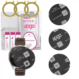3 x szkło hybrydowe apgo Hybrid Flexible Nano Glass Matte; 1 x sucha ściereczka wielokrotnego użytku; 3 x mokra ściereczka (apgo lub inna w zależności od dostępności); 1 x rakla ułatwiająca montaż; 1 x zestaw naklejek służący do usuwania kurzu tuż przed nałożeniem produktu; 3 x podkładka samoprzylepna ułatwiająca montaż; Po co te kółeczka z uszami ? : ) To podkładki samoprzylepne. Podkładki samoprzylepne rozwiązują problem przesuwającego się urządzenia po blacie podczas montażu. Zegarek/smartwatch/opaska ze względu na swoje małe rozmiary potrafi mocno przesuwać się po blacie podczas montażu. Podkładki samoprzylepne rozwiązują ten problem.