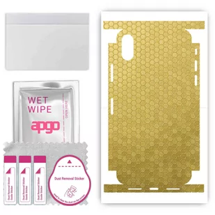 Skórki posiadają kształt oraz niezbędne wycięcia/otwory dopasowane do wybranego przez Ciebie urządzenia. Skórka strukturalna dedykowana na TYŁ+BOKI do Apple iPhone XS. Wykonana z folii strukturalnej winylowej imitującej Plaster Miodu Złoty. Skin nada nowego wyglądu; Poprawia przyczepność, chwyt w dłoni; Chroni przed porysowaniem i odciskami palców; Wprowadza dodatkową ochronę przed stłuczeniami; W zestawie: 1 x skórka na TYŁ+BOKI; 1 x sucha ściereczka wielokrotnego użytku; 1 x mokra ściereczka (apgo lub inna w zależności od dostępności); 1 x rakla ułatwiająca montaż; 1 x zestaw naklejek służący do usuwania kurzu tuż przed nałożeniem produktu; Zobacz koniecznie jak montować.