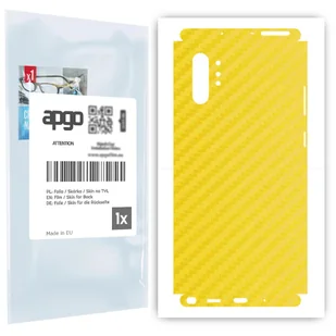 Skórki posiadają kształt oraz niezbędne wycięcia/otwory dopasowane do wybranego przez Ciebie urządzenia. Skórka strukturalna dedykowana na TYŁ+BOKI do Samsung Galaxy Note 10+. Wykonana z folii strukturalnej winylowej imitującej Carbon Żółty. Skin nada nowego wyglądu; Poprawia przyczepność, chwyt w dłoni; Chroni przed porysowaniem i odciskami palców; Wprowadza dodatkową ochronę przed stłuczeniami; W zestawie: 1 x skórka na TYŁ+BOKI; 1 x sucha ściereczka wielokrotnego użytku; 1 x mokra ściereczka (apgo lub inna w zależności od dostępności); 1 x rakla ułatwiająca montaż; 1 x zestaw naklejek służący do usuwania kurzu tuż przed nałożeniem produktu; Zobacz koniecznie jak montować.