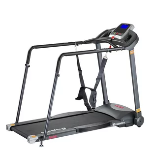 Bieżnia rehabilitacyjna inSPORTline Neblin z poręczą to specjalna bieżnia przeznaczona do celów rehabilitacyjnych. Po obu stronach sprzętu zamocowane są komfortowe, wykonane z miękkiego materiału, poręcze, które zapewniają wysoki poziom bezpieczeństwa podczas chodzenia po pasie bieżni. Poręcze zapewniają stabilne podparcie dla osoby ćwiczącej, na każdym etapie korzystania z urządzenia. Dodatkowo, bieżnia jest wyposażona w poręcz z przodu pasa, która również znacznie podnosi komfort użytkowania. Bieżnia posiada bardzo małą prędkość początkową, wynoszącą zaledwie 0,3 km/h, dzięki czemu sprawdza się idealnie dla wszystkich grup wiekowych, także do celów rehabilitacyjnych i w okresie rekonwalescencji po ciężkich urazach.