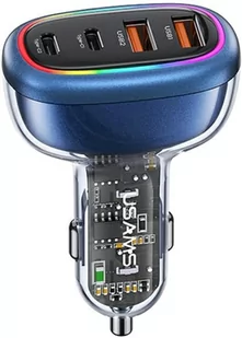 Ładowarka samochodowa USAMS US-CC169Przeźroczysty mechaniczny design idealnie ukazuje detale precyzyjnych komponentów tego urządzenia. Ładowarka posiada ciepłe lampy RGB, które zapalają się w momencie kiedy zapada ciemność. Miękkie światło lampki jest bardzo delikatne i praktytczne, kiedy prowadzisz swój samochód nocą- nie musisz się martwić, że coś Cię będzie rozpraszało czy Cię oślepi. Urządzenie wyposażono w cztery porty USB i każdy z nich zawsze umożliwia szybkie ładowanie i jest kompatybilne z takimi protokołami jak PPS/PD3. 0/PD2. 0. Dwa porty USB oraz dwa porty USB-C połączona z dużą mocą urządzenia pozwalają na ładowanie kilku urządzeń jednocześnie, a Ty oszczędzasz swój cenny czas.