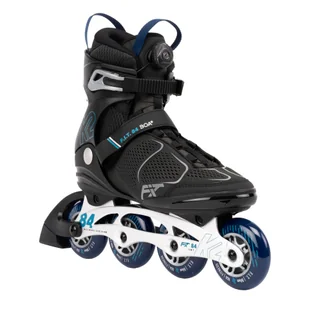 Rolki męskie - Rozmiar kółek: 84 mm • Twardość kółek: 80A • Liczba kółek: 4 • Łożyska: ILQ 7 • Kolor: czarny - niebieski • Hamulec: Tak • System zapinania: BOA + rzep + klamra • Materiał ramy: Aluminium