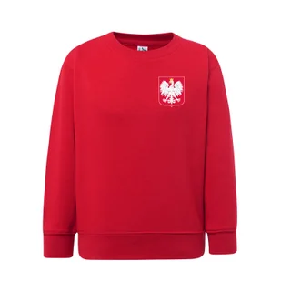 WYKAZ CECH: Na prodzie godło narodowe w postaci nadruku (w kolorze) Klasyczna bluza dresowa dla dzieci Okrągły dekolt wokół szyi Podwójne przeszycia ściągaczy i rękawów. Elastyczne ściągacze 2x1 rękawów i u dołu bluzy Gramatura:
