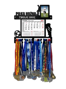 Wieszak na medale PIŁKA NOŻNA z kalendarzem i ramką na zdjęcie imię 385. 1 Wieszak na medale to świetne rozwiązanie dla każdego, kto nie chce chować swoich osiągnięć do szafy. Wieszak na medale z imieniem to naprawdę osobisty i wyjątkowy sposób na przechowywanie i eksponowanie swoich osiągnięć. Oto kilka powodów, dlaczego taki wieszak jest atrakcyjnym rozwiązaniem: Osobisty akcent: