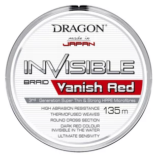 Plecionki Invisible Vanish Red firmy Dragon przeznaczone są do połowu sandaczy, okoni, a nawet szczupaków, różnymi metodami spinningowymi. Specyficzny odcień czerwieni jest dość dobrze widoczny na powierzchni dla wędkarza, zupełnie odwrotnie niż dla ryb pod powierzchnią, a to dzięki zjawisku zanikania czerwonego widma światła. Plecionki Invisible Vanish Red są idealne do łowienia z opadu i wszędzie tam, gdzie widoczność linki pozwala na większą skuteczność w prowadzeniu przynęty i zacięciu ryby. Teflonowa warstwa ochronna znacznie wydłuża okres użytkowania plecionek, zabezpieczając ich powierzchnię przed uszkodzeniami mechanicznymi i niekorzystnym wpływem warunków zewnętrznych.