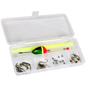 - 10 małych haczyków - 10 dużych haczyków - 10 ciężarków - 1 błystkę - 2 pływaki - 5 zapięć obrotowych - 1 pudełko plastikowe Dane techniczne: