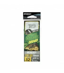 Haczyki z przyponami FDB-03 marki OWNER Przypony z plecionki do Method Feeder ze stoperem Quick Stop. Każdy przypon ma długość 10 cm. Przypony o rozmiarze #6 mają średnicę 0,18 mm. Przypony o rozmiarach #8 i #10 mają średnicę 0,15 mm. Przypony o rozmiarze #12 mają średnicę 0,12 mm.