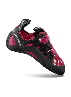 Buty wspinaczkowe damskie La Sportiva Tarantula - red plum/ red to model o małej asymetrii i usztywnionej podeszwie, dzięki czemu pozwala na nieco dłuższy trening osobom, których stopy nie są przyzwyczajone do obuwia wspinaczkowego. Buty te posiadają dość dużą twardość, co zapewnia optymalne wsparcie na ścianie i pomaga w pokonywaniu pierwszych dróg. Zastosowano w nich zapięcie na rzepy, które umożliwia ich precyzyjne, a przy tym niezwykle szybkie założenie. Zastosowana w podeszwie guma FriXion® w wersji Black zapewnia wysoką przyczepność. Cholewkę wykonano z naturalnej skóry zamszowej, przez co z łatwością dopasowuje się do stopy.