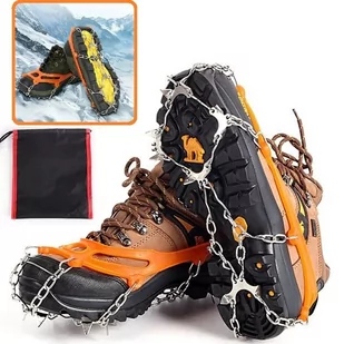 Materiał: silikon o podwyższonej odporności + stalowy łańcuch i kolce 8 haków z hartowanej stali (na każdego buta) Stalowy łańcuch łączący haki Elastyczny silikon który dobrze trzyma się obuwia Rozmiar buta: 38-45 Grubość gumy: 0,5 cm Kolor: jak na zdjęciu Do każdej pary załączony jest worek do przechowywania
