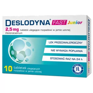 Deslodyna Fast Junior to lek w postaci tabletek ulegających rozpadowi w jamie ustnej, wydawany bez recepty. Lek zawiera desloratadynę w dawce 2,5 mg o działaniu przeciwhistaminowym. Deslodyna Fast Junior przeznaczona jest do stosowania u dorosłych, młodzieży i dzieci w wieku 6 lat i starszych. Lek nie powoduje senności. Działanie: łagodzi objawy reakcji alergicznych, między innymi: