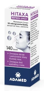 . Opis: Hitaxa Metmin-Spray 50 mikrogramów/dawkę aerozol do nosa to produkt leczniczy, którego substancją czynną jest mometazonu furoinian, który należy do leków zwanych kortykosteroidami. . Skład: Substancją czynną leku jest mometazonu furoinian. Każda dawka zawiera 50 mikrogramów mometazonu furoinianu w postaci mometazonu furoinianu jednowodnego. Pozostałe składniki to: benzalkoniowy chlorek, roztwór, glicerol, polisorbat 80, celuloza mikrokrystaliczna i karmeloza sodowa, kwas cytrynowy jednowodny, sodu cytrynian, woda oczyszczona.