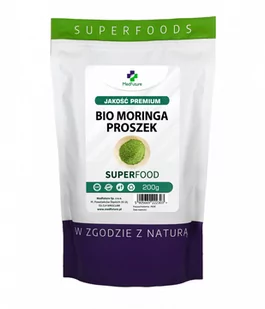 Super Food Moringa to suplement diety zawierający w swoim składzie ekologiczny wyciąg z drzewa Moringa uprawianego w strefach tropikalnych i subtropikalnych. W celu odpowiedniej suplementacji diety w składnik w nim zawarty zaleca się stosować 2 łyżeczki preparatu dziennie. Opakowanie zawiera 200 g produktu.