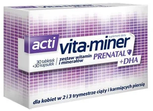 Vita-miner Prenatal+ DHA jest to suplement diety zawierający zestaw witamin oraz minerałów dla kobiet w 2 i 3 trymestrze ciąży a także karmiących piersią.