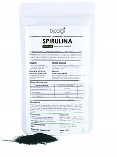 Spirulina w proszku od bioalgi to sproszkowana, 100% alga Spirulina platensis. Doświadczenie i wieloletnie badania sprawiły, że otrzymany produkt jest nie tylko w pełni naturalny, ale również wysokiej jakości i zawiera wysokie stężenie składników odżywczych. Spirulina w proszku od bioalgi - jakość poparta certyfikatami Febico, czyli producent Spiruliny w proszku bioalgi posiada certyfikaty, które są niezbędne, aby poświadczyć produkt najwyższej jakości. Są to m. in. : badania na obecność wielopierścieniowych węglowodorów aromatycznych (WWA) analiza mikrobiologiczna certyfikat jakości ISO 22000 certyfikat potwierdzający brak zawartości jodu certyfikat jakości HACCP ISO 22000 certyfikat GMP (Good Manufacturing Practice) Szczegółowy skład Spiruliny Witaminy (100 g): 1. Beta-karoten 64-96 mg 2.