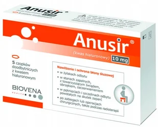 Anusir czopki na hemoroidy 5 sztuk Czopek przeznaczony jest do stosowania doodbytniczego, w celu nawilżenia i ochrony błony śluzowej, w stanach wymagających pobudzenia naturalnych procesów regeneracji i gojenia się błony śluzowej odbytnicy oraz kanału odbytu. Zastosowanie Anusir przeznaczony jest do stosowania doodbytniczego, w celu nawilżenia i ochrony błony śluzowej, w stanach wymagających pobudzenia naturalnych procesów regeneracji i gojenia się błony śluzowej odbytnicy oraz kanału odbytu. Sytuacje takie występują szczególnie w następujących przypadkach: po zabiegach lub operacjach chirurgicznych, także podczas radioterapii, w stanach zapalnych, z towarzyszącym świądem, obrzękiem, zaczerwienieniem, w żylakach odbytu, w pęknięciach i szczelinach odbytu powstałych na skutek zaparć. Skład 1 czopek o masie 2 g zawiera: