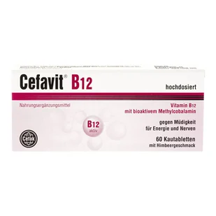 Produkt Cefavit B12, 60 tabletek do kupienia w Gemini. Cefavit B12, tabletki do żucia. Witamina B12 przyczynia się do utrzymania prawidłowego metabolizmu energetycznego oraz pomaga w prawidłowym funkcjonowaniu układu ...