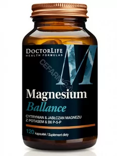 Doctor Life Magnesium Ballance Cytrynian - Jabłczan magnezu -Potas-Witamina B6, 120 kapsułekMAGNESIUM BALLANCE zawiera magnez w postaci cytrynianu oraz jabłczanu magnezu z potasem i witaminą B6, która optymalizuje metabolizm i skuteczność magnezu. Magnez w formie jabłczanu jest związkiem magnezu i kwasu jabłkowego i szczególnie korzystną dla organizmu formą magnezu. Wspiera on prawidłowe funkcjonowanie mięśni, zdrowie układu sercowo-naczyniowego, produkcję energii i jest polecany szczególnie osobom przemęczonym. Magnez jest niezbędnym minerałem dla ponad 300 reakcji enzymatycznych w metabolizmie i produkcji energii. Magnez ma korzystny wpływ na układ nerwowy i mięśniowy.