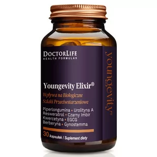 Odmłodzenie komórkowe, rewitalizacja mitochondriów Zastosowanie • YOUNGEVITY ELIXIR ZAPEWNIA WSPARCIE ODŻYWCZE ORGANIZMU, WSPOMAGA ZDROWIE KOMÓRKOWE I OPÓŹNIA STARZENIE • FORMUŁA ZOSTAŁA SPECJALNIE OPRACOWANA, ABY ZAPEWNIĆ WSPARCIE PODCZAS DIET I POSTÓW OGRANICZAJĄCYCH KALORIE • SUBSTANCJE ZAWARTE W SKŁADZIE HAMUJĄ7 GŁÓWNYCH SZLAKÓW PRZECIWSTARZENIOWYCH* • CZARNY IMBIR WSPOMAGA O 15 RAZY MOCNIEJ NIŻ RESWERATROL AKTYWNOŚĆ SIRTUINY, SUBSTANCJI KTÓREJ UBYWA Z WIEKIEM, A KTÓRA ODPOWIEDZIALNA JEST ZA ODMŁODZENIE KOMÓREK Składniki i ich działanie UROLITYNA A - Wspiera odnowę mitochondrialną, wzmacnia funkcje mięśni, zwiększa energię komórkową i wpływa na zdrowe starzenie, wzmaga autofagię, naturalny proces odnowy komórkowej, w którym organizm degraduje i przetwarza składniki komórkowe, a także mitofagię, oczyszczanie i recykling starszych i dysfunkcyjnych mitochondriów. EGCG (GALUSAN EPIGALLOKATECHINY) - To polifenol o silnych właściwościach przeciwutleniających, zwalcza nadmiar wolnych rodników, obniża ryzyko raka prostaty, okrężnicy oraz piersi, poprawia funkcjonowanie mózgu, zwiększa pamięć i skupienie, reguluje poziom cholesterolu i wrażliwość na insulinę w organizmie. KWERCETYNA - Ma silne właściwości przeciwutleniające, ponadto substancja znana jest z działania przeciwwirusowego i niwelującego stany zapalne poprzez hamowanie odpowiedzialnych za ich wytwarzanie enzymów m. in. cyklooksygenazy(COX) i lipooksygenazy (LOX). GYNOSTEMMA - Działa antyoksydacyjnie, normalizuje poziom cholesterolu i trójglicerydów, działa neuroprotekcyjnie, zwiększa poziom dopaminy istotnej w łagodzeniu objawów ch.