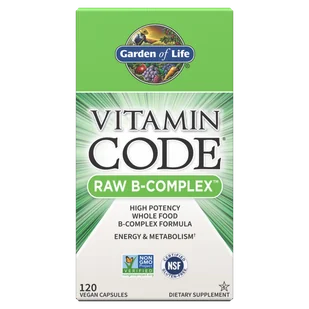 GARDEN OF LIFE Vitamin Code Raw B-Complex to kompleks witamin z grupy B w metylowanych i koenzymatycznych formach. W składzie tego produktu możemy znaleźć najważniejsze witaminy z grupy B : witamina B1, witamina B2, witamina B3, witamina B5, witamina B6, Biotyna, Kwas foliowy oraz witamina B12. Dodatkowo w GARDEN OF LIFE Vitamin Code Raw B-Complex znajdują się enzymy, probiotyki oraz mieszanka organicznych rośliny, które idealnie komponują się z witaminami z grupy B. Suplement ten pomaga w prawidłowej produkcji czerwonych krwinek i krwi (ze względu na zawartość witaminy B12 i folianów), przyczynia się do prawidłowej syntezy i metabolizmu hormonów steroidowych, witaminy D i niektórych neuroprzekaźników (ze względu na zawartość kwasu pantotenowego) oraz pomagają w prawidłowym funkcjonowaniu układu odpornościowego i nerwowego (ze względu na zawartość witaminy B6).