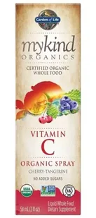 Mykind Organics Witamina C Organiczny spray, Witamina C w sprayu, Wiśnia i Mandarynka, 58 ml Mykind Organics Witamina C w sprayu ma na celu dostarczanie witaminy C w łatwej w użyciu postaci płynnej . Pięć sprayów zawiera 67% zalecanej dziennej dawki witaminy C. Wszystko to bez sztucznych dodatków i chemicznych konserwantów - po prostu organiczna witamina o smaku pomarańczowo-mandarynkowym. przyjemny smak, spodoba się nawet najmłodszym 60 mg witaminy C o jakości organicznej z całej żywności Spray o smaku mandarynki i pomarańczy, bez dodatku cukru i bez stewii. wytwarzany z jagód amla – agrestu indyjskiego.