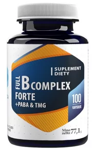Skład: Wielkość opakowania: 100 kapsułek Porcja jednorazowa: 1 kapsułka Ilość porcji w opakowaniu: 100 Składniki 1 kapsułka RWS Tiamina 44,5 mg 4045% Ryboflawina 37 mg 2645% Niacyna 50 mg 313% Witamina B6 18 mg 1286% Kwas pantotenowy 100 mg 1667% Kwas foliowy (z 500 mcg Quatrefolic®) 270 μg 135% Witamina B12 100 μg 4000% Biotyna 200 μg 400% Cholina 39 mg <> Inozytol 60 mg <> Kwas para aminobenzoesowy PABA 25 mg <> Trimetyloglicyna TMG 200 mg <> RWS - Dzienna referencyjna wartość spożycia <> Nie ustalono dziennej referencyjnej wartości spożycia Składniki: trimetyloglicyna, D-pantotenian wapnia, dwuwinian choliny, inozytol, chlorowodorek tiaminy (witamina B1), ryboflawiny 5′-fosforan sodowy (witamina B2), amid kwasu nikotynowego (niacyna), pirydoksalo-5-fosforan (witamina B6), kwas para aminobenzoesowy, substancja przeciwzbrylająca – dwutlenek krzemu, sól glukozaminowa kwasu (6S) -5 metylotetrahydrofoliowego (Quatrefolic®), O-biotyna,.